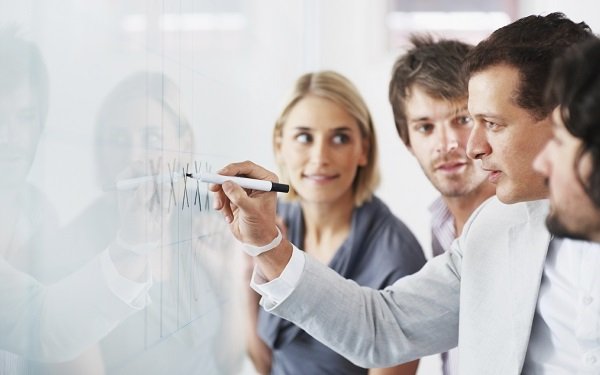 Business people looking at their leader while he explaining something on whiteboard